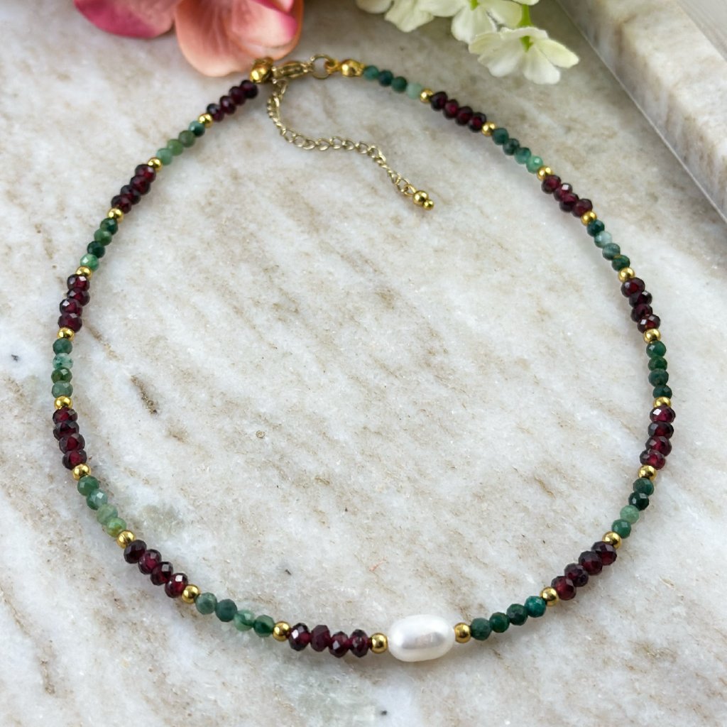 Náhrdelník se smaragdy a granáty. Jedinečný náhrdelník spojuje sílu přírodních kamenů s jemnou elegancí perel. Je vyroben z hluboce zeleného smaragdu a temně červeného granátu, jejichž kontrast vytváří harmonickou a zároveň výraznou kombinaci. Celý šperk doplňuje pravá říční perla, která svým jemným leskem dodává náhrdelníku nádech ženskosti a nadčasové elegance. Perla krásně vyvažuje syté barvy minerálů a činí z náhrdelníku nezaměnitelný, sofistikovaný doplněk.