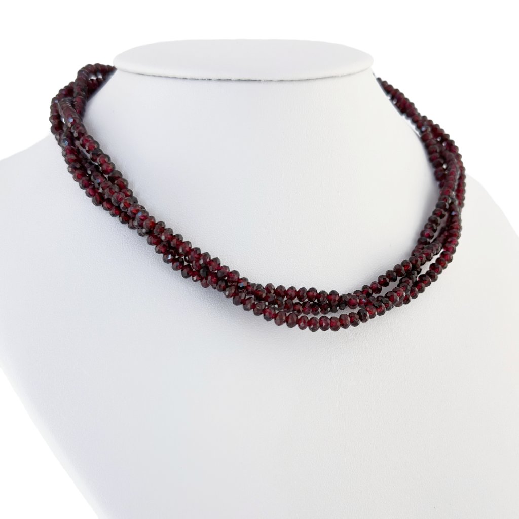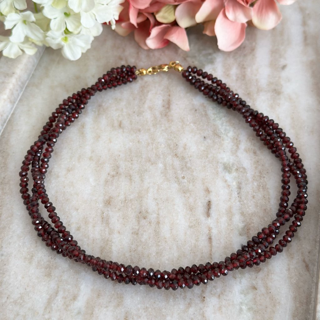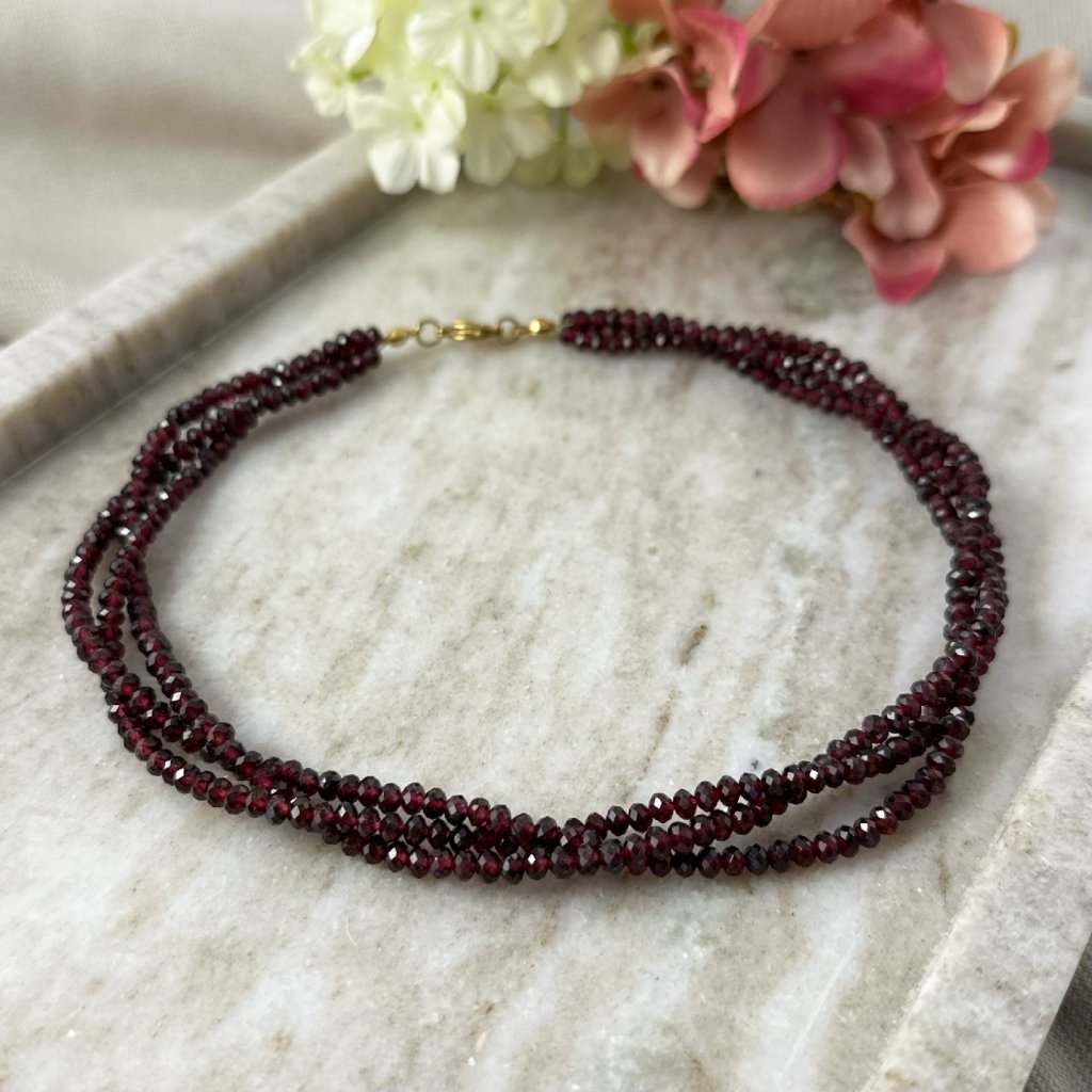 Luxusní trojitý náhrdelník z přírodního granátu. Dopřejte si šperk, který vyzařuje sofistikovanost a nadčasovou eleganci. Tento luxusní trojitý náhrdelník z granátu je ručně vyrobený s precizností a citem pro detail. Granátové korálky jsou pečlivě vybírány pro svou kvalitu a sytou rubínově červenou barvu, která okouzlí na první pohled.