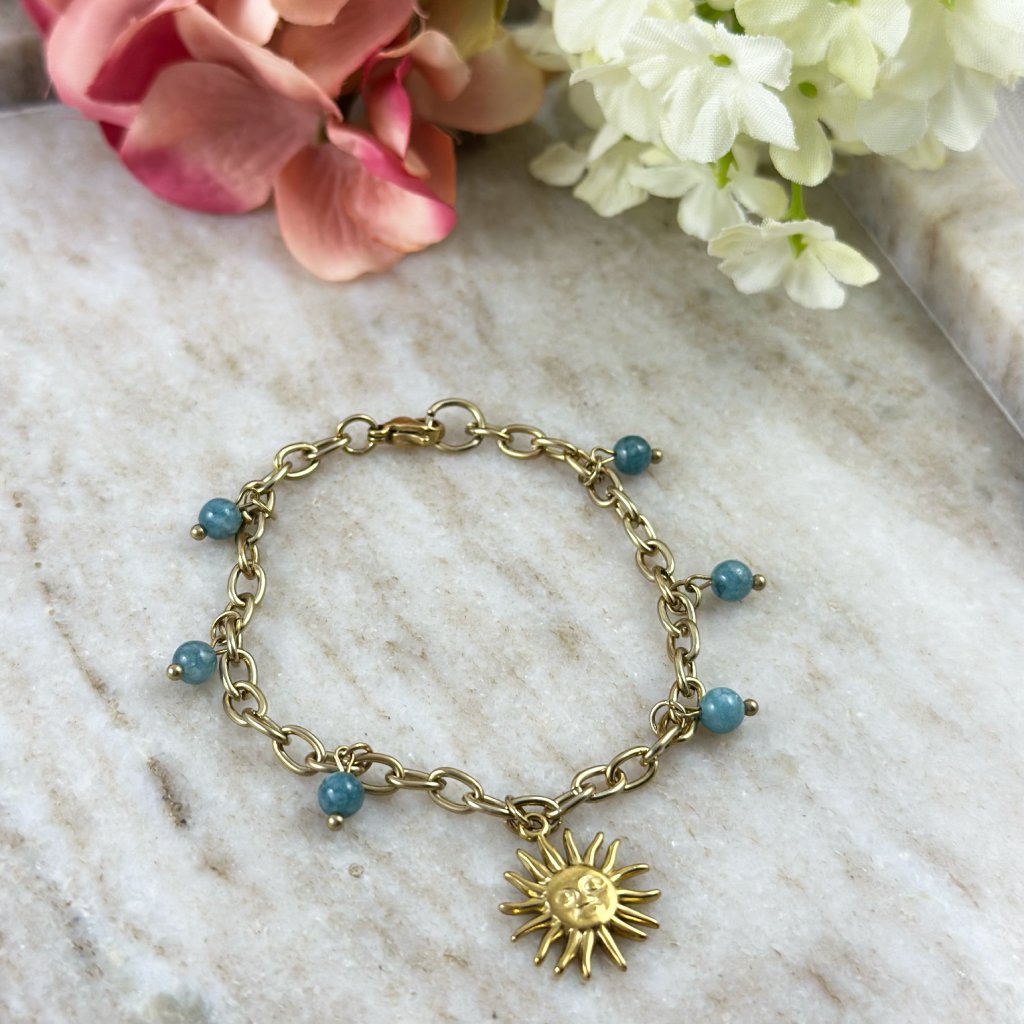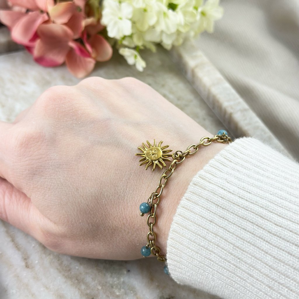 Náramek s akvamarínem a přívěskem slunce. Objevte jemný náramek, který spojuje detailní práci kovového řetízku s magickým kouzlem akvamarínových korálků a symbolickým přívěskem slunce. Drobné kamínky akvamarínu se při pohybu lehce třpytí a dodávají šperku svěžest, klid a jemně éterický vzhled. Dominantním prvkem je přívěsek slunce — symbol světla, radosti a pozitivní energie. Náramek je ideální pro každodenní nošení, krásně se vrství s dalšími šperky a díky svému symbolickému významu je i skvělým dárkem.