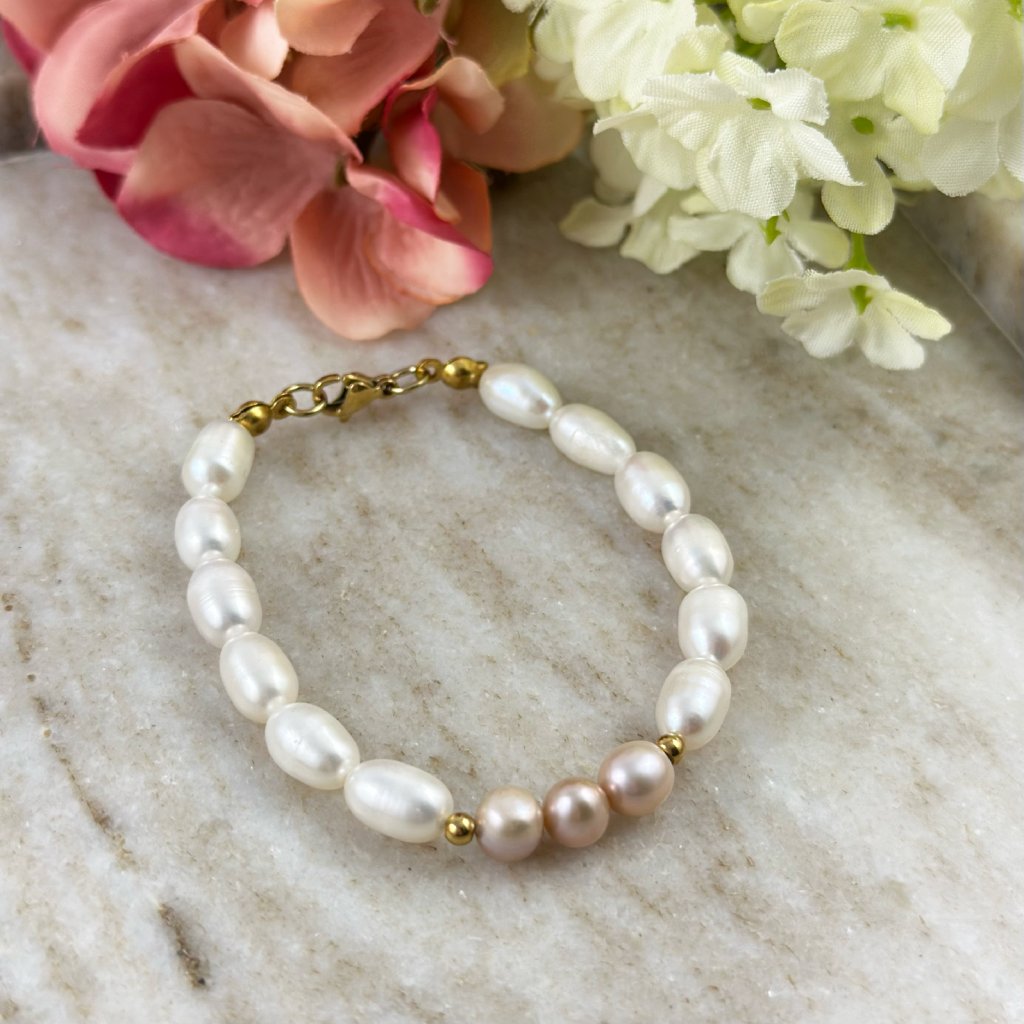 Perlový náramek Paloma. Jemný náramek z pravých bílých říčních perel okouzlí svou čistotou a nadčasovým vzhledem. Dominantním detailem jsou tři růžové říční perly, které dodávají šperku jemný barevný akcent a romantický nádech. Perfektně se hodí jak k běžnému outfitu, tak k slavnostním chvílím — je to šperk, který nikdy neztratí svůj půvab.