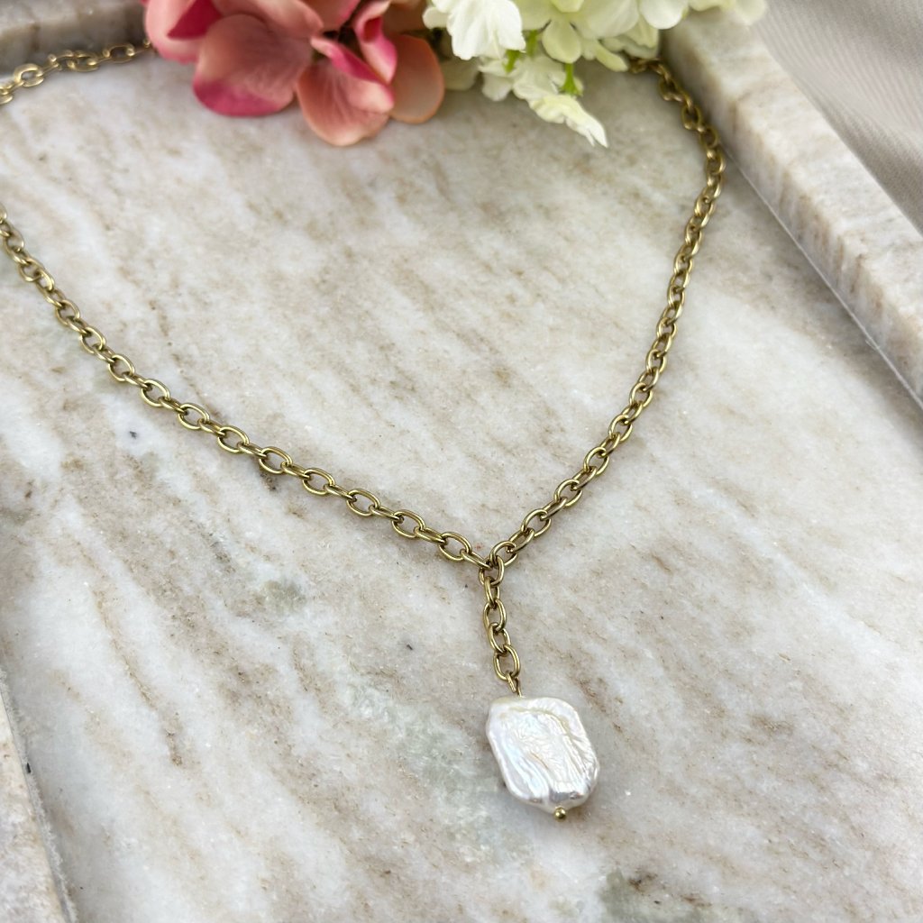 Řetízek s pravou barokní perlou. Nadčasový náhrdelník spojuje čistou eleganci s jedinečnou krásou přírody. Řetízek z chirurgické oceli zdobí výrazná barokní perla, která díky svému nepravidelnému tvaru působí originálně, luxusně a naprosto jedinečně — žádné dvě perly nejsou stejné. Perla se při pohybu jemně leskne a stává se přirozeným středem pozornosti. Minimalistický design řetízku nechává vyniknout její přirozený tvar i perleťový povrch. Chirurgická ocel je navíc odolná, hypoalergenní a nemění barvu, takže šperk si zachová svou krásu při každodenním nošení.