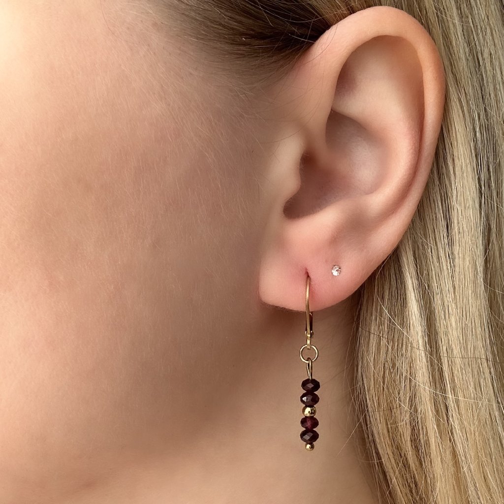 Visací náušnice s granátem. Granát je minerál, který podporuje sílu a odhodlání. Také dodává životní energii a vytrvalost.
